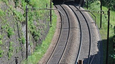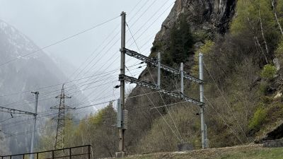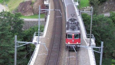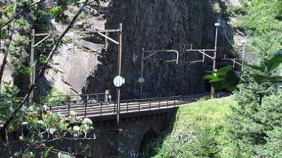 Typisch voor het Zwitserse spoor zijn de portaalmasten. Zoals deze bij de Prato keertunnel. De overspanning is in delen getekend en kan makkelijk worden verlengd voor overspanning van meerdere sporen door er delen aan toe te voegen.