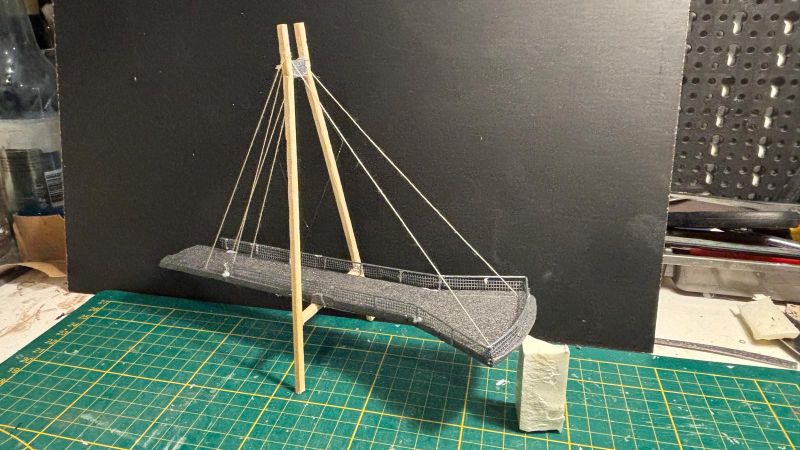 De enkele draad krijg ik niet goed geleid langs de masten en de kabel buigt door onder het gewicht van de gondel.