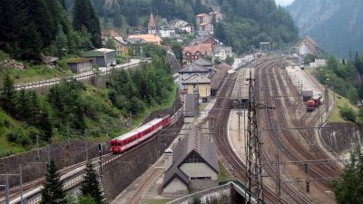 De Matterhorn Gotthard Bahn (MGB) komt ook uit op het station. De smalspoor tandradbaan loopt over een brug de bergen in.
