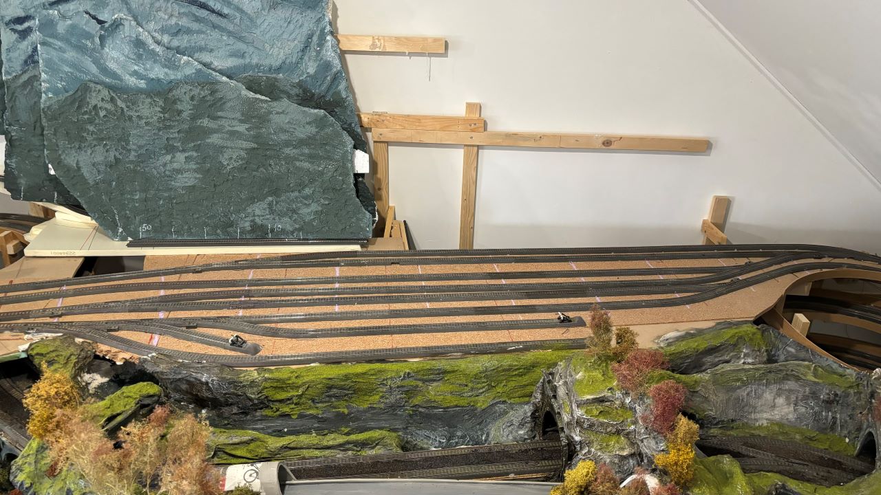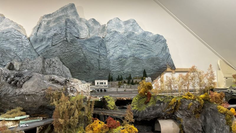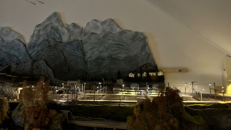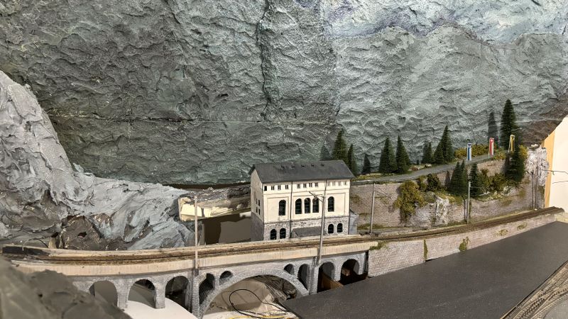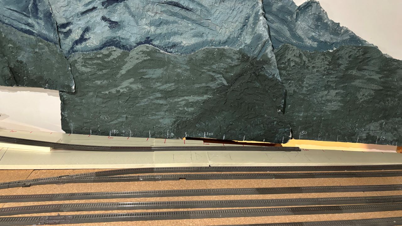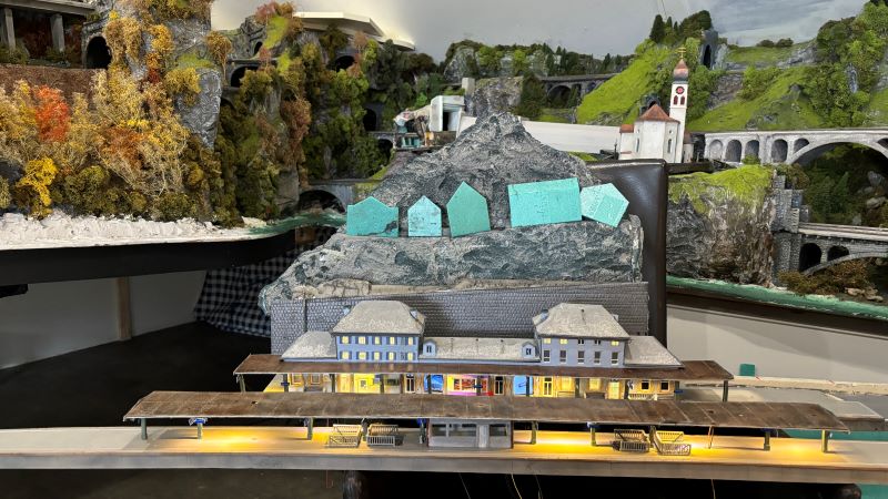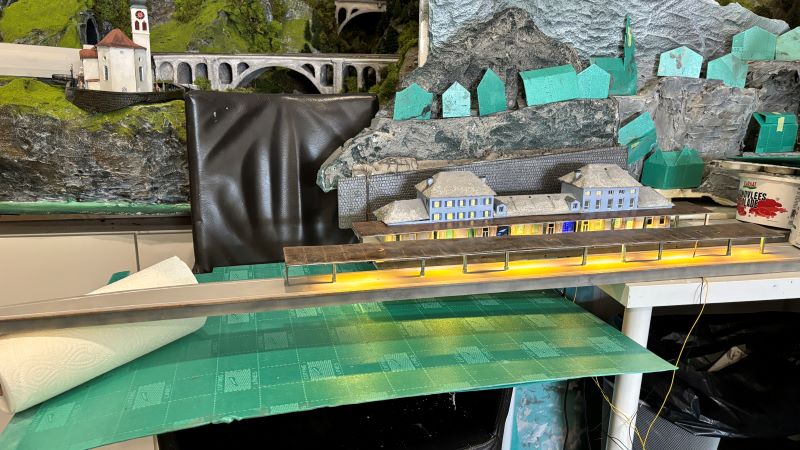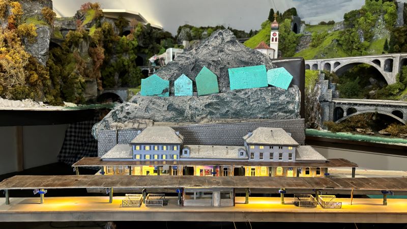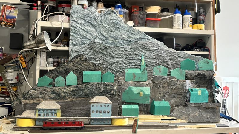 Verder naar rechts komt in de achtergrond het dorp Göschenen. Tegen de wand “halve huizen”. Eerst een mocukp gemaakt om te kijken of dit het gewenste effect heeft. Dat lijkt te lukken, dus aan de slag met de gebouwen.