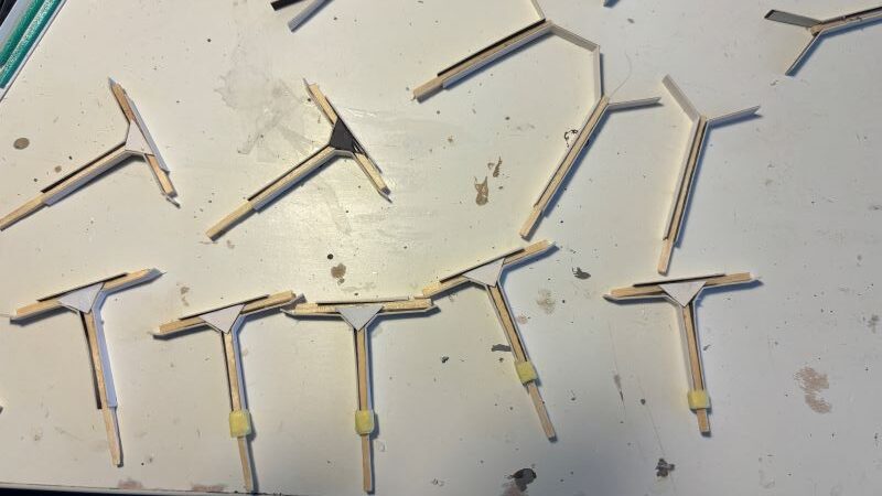 De perronoverkapping wordt gedragen door een metalen constructie van H-balken. Die maak ik na van stroken karton van 4mm met een balk van 2mm XPS. De staanders zijn van lucifers beplakt met strookjes karton.