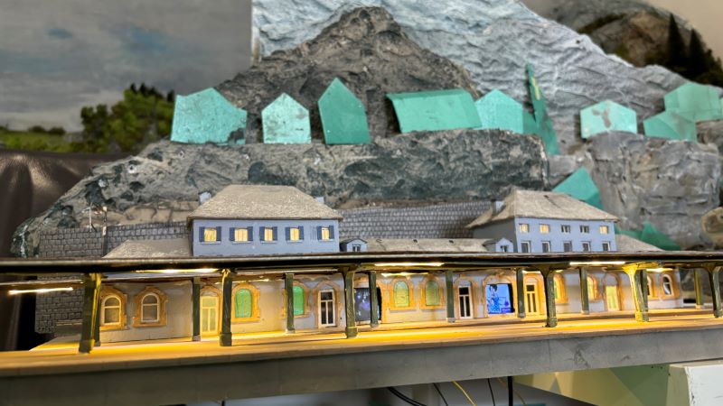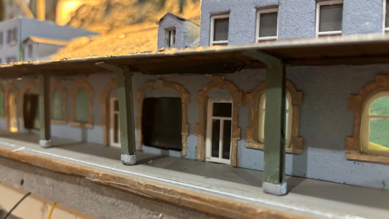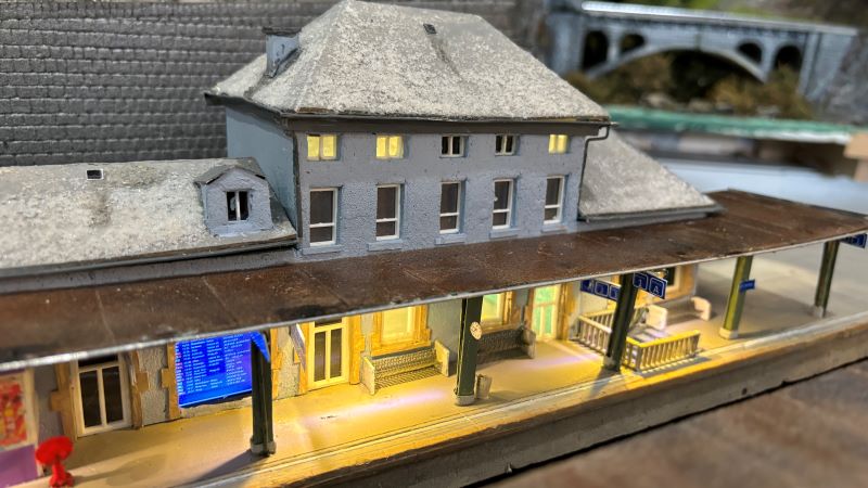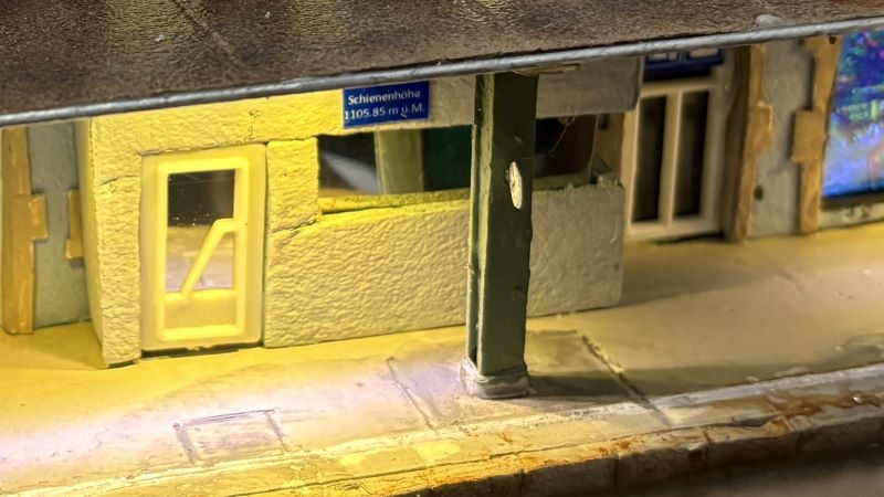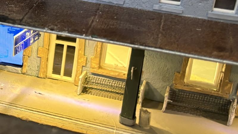 Het stationsgebouw is complete zelfbouw. De muren van XPS. De ramen zijn omlijst met stenen, die maak ik van karton. De raamluiken van Tie-wraps.