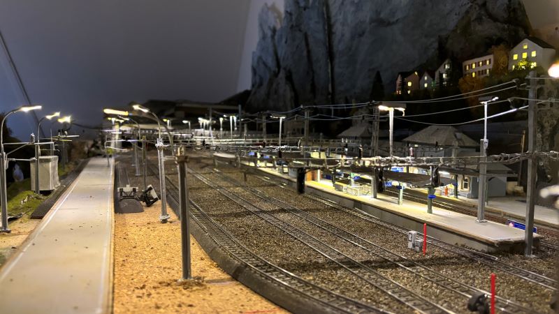 Alle bovenleidingportalen zijn gemaakt, op hun plaats gezet en de verlichting is aangesloten.