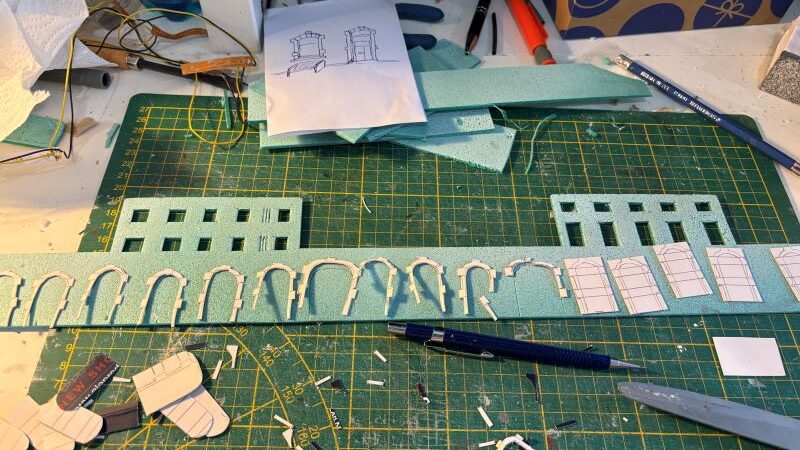 Het stationsgebouw is complete zelfbouw. De muren van XPS. De ramen zijn omlijst met stenen, die maak ik van karton. De raamluiken van Tie-wraps.