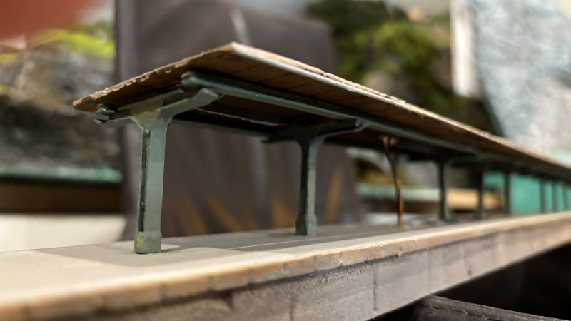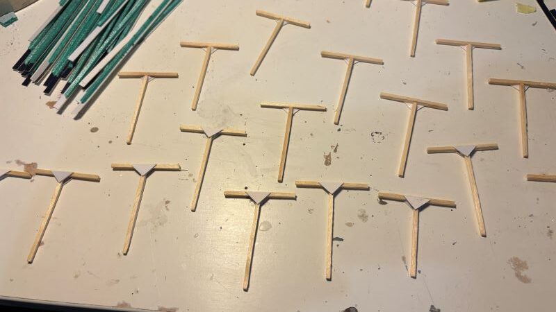 De perronoverkapping wordt gedragen door een metalen constructie van H-balken. Die maak ik na van stroken karton van 4mm met een balk van 2mm XPS. De staanders zijn van lucifers beplakt met strookjes karton.