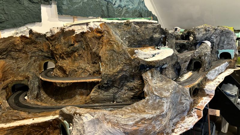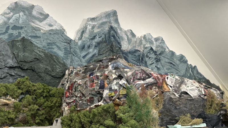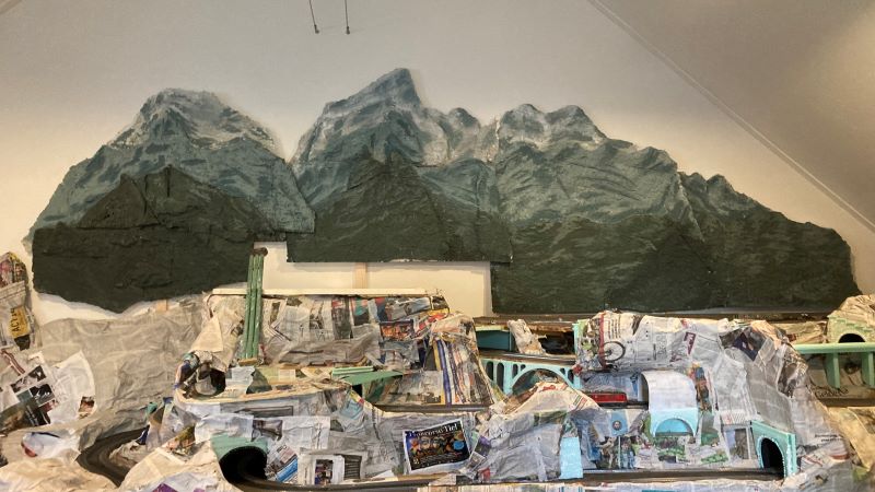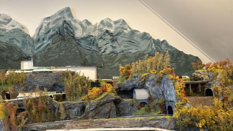 Het berglandschap mag gerust overweldigend zijn. De achterwand wordt daarom geen foto maar een reliëf voor wat meer dieptewerking. Een aantal piepschuim platen bewerkt met de soldeerbout zodat een rotsstructuur ontstaat. De kunst is nog om deze zo te schilderen dat het bergen in de achtergrond lijken.