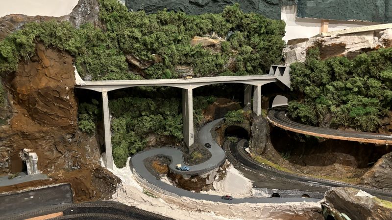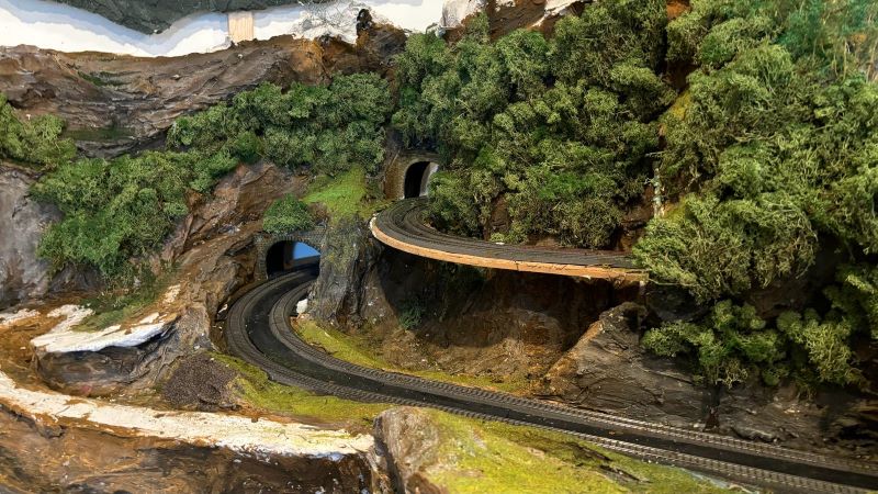 Na de Prato keerlus gaat het spoor achter de coulissen weer omhoog om het hoogteverschil in model bij de Biaschina goed uit te laten komen voor de Pianotondobrug. Het spoor hangt nu nog in de lucht, de brug moet nog worden gemaakt. Onder de brug wat extra diepte aangebracht zodat deze wat hoger lijkt.