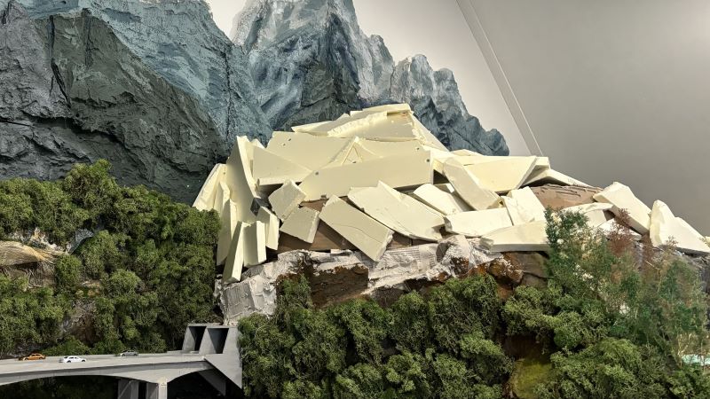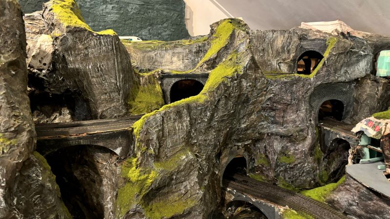 Het berglandschap mag gerust overweldigend zijn. De achterwand wordt daarom geen foto maar een reliëf voor wat meer dieptewerking. Een aantal piepschuim platen bewerkt met de soldeerbout zodat een rotsstructuur ontstaat. De kunst is nog om deze zo te schilderen dat het bergen in de achtergrond lijken.