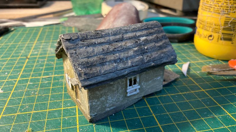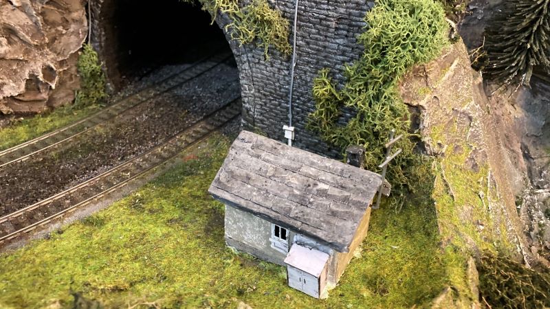Bij de tunnel staat een baanwachtershuis. Een kozijn uitgezocht en de raamstijl uitgesneden zodat het op de realiteit lijkt. Van karton het huisje gemaakt. Het leistenen dak van dunne geknipte kartonnen strookjes gefabriceerd. Het huisje met latexverf ingesmeerd om alle kieren te dichten. Het dak was een beetje te grof daarom met schuurpapier iets vlakker gemaakt. Een mooi verfje doet de rest.