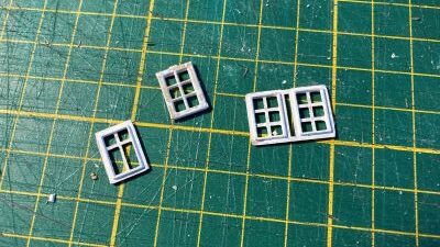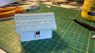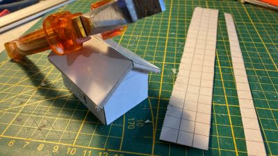 De schoorsteen en antenne maken het af. De lijmresten zijn nog zichtbaar want de lijm is nog niet uitgehard en droogt dan wel transparant op.