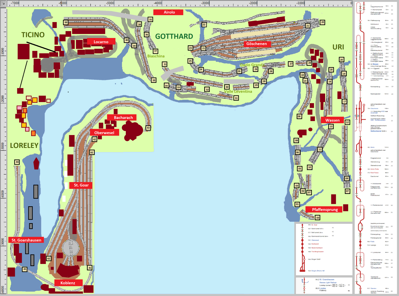 Het spoortraject loopt langs de Loreley in Duitsland, over het Zwitserse bergtraject Gotthard, naar Locarno aan het Lago Maggiore. Het is onmogelijk om dit op H0-schaal (1:87) na te maken. Ik probeer daarom de impressie van het landschap met alle bezienswaardigheden te realiseren in model.