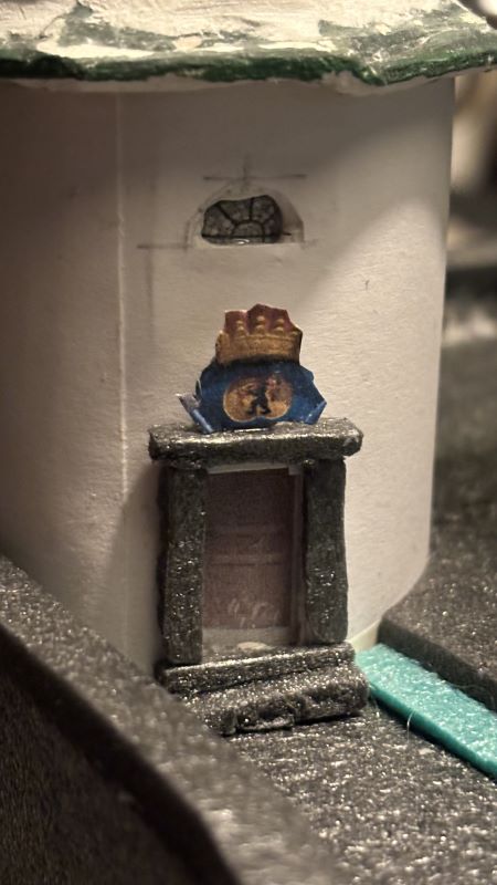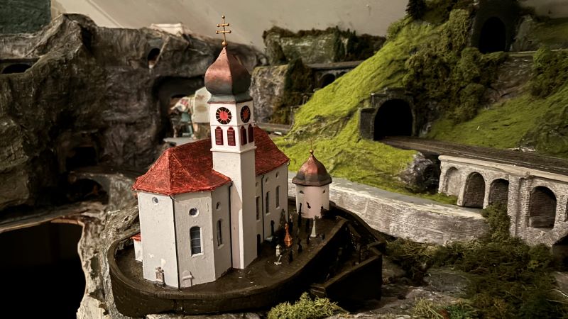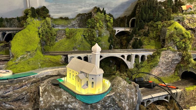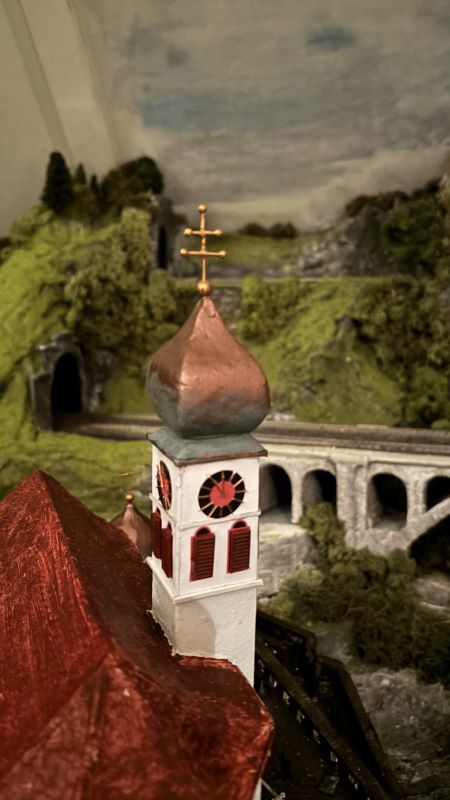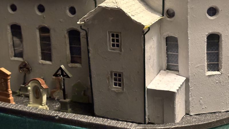 Het kerkje is nagemaakt van foto’s. De schaal zit tussen H0 en N in, ongeveer 1:100. Gebouwd van karton. De “vierkante ui” is gemaakt van klei. Een bol zilverpapier en daaromheen de klei. Met een mal geprobeerd om de vier zijden gelijk te krijgen. Na drogen met vijl en schuurpapier gezorgd voor een glad geheel. In de XPS-muur van de omheining zit een LED-strip om het gebouw uit te lichten.