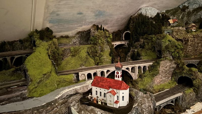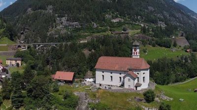 Op reis naar de Gotthard per trein zie je de kerk bij Wassen drie keer. Via de bruggen en keertunnels komt de trein op hoogte en slingert langs de kerk.