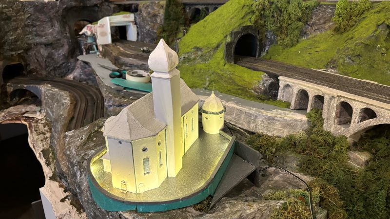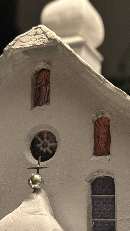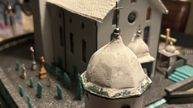 Het kerkje is nagemaakt van foto’s. De schaal zit tussen H0 en N in, ongeveer 1:100. Gebouwd van karton. De “vierkante ui” is gemaakt van klei. Een bol zilverpapier en daaromheen de klei. Met een mal geprobeerd om de vier zijden gelijk te krijgen. Na drogen met vijl en schuurpapier gezorgd voor een glad geheel. In de XPS-muur van de omheining zit een LED-strip om het gebouw uit te lichten.